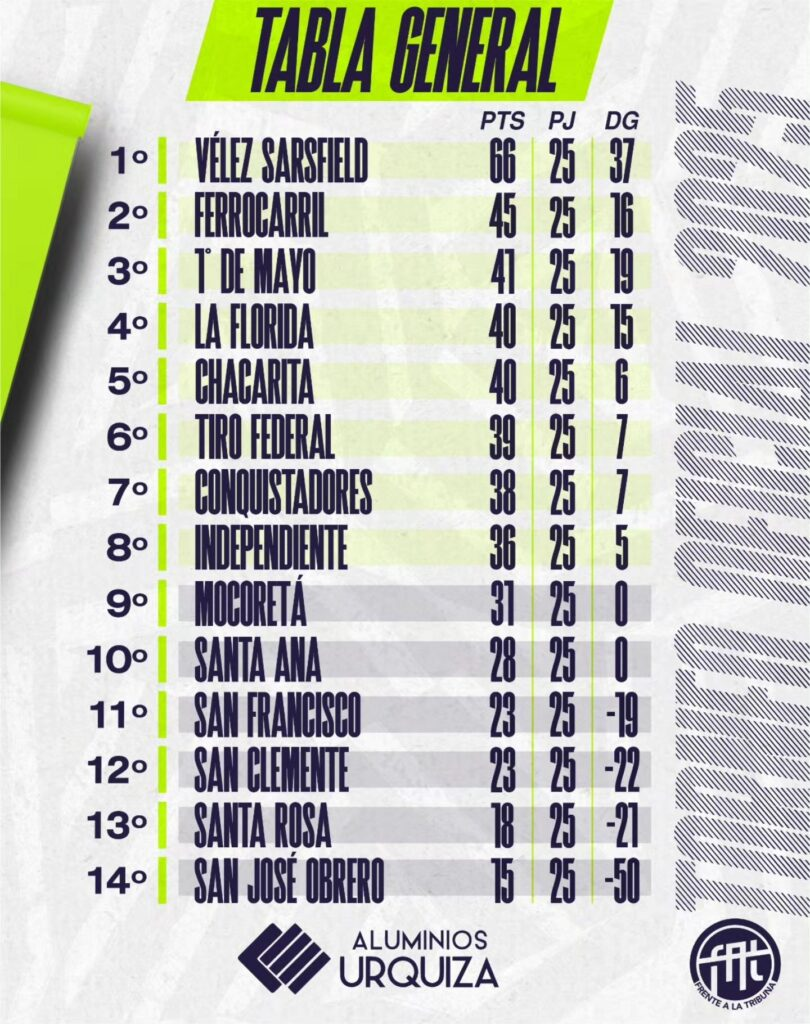 Luego de terminar este domingo la fecha 25, quedaron definidos los ocho equipos que avanzan a la siguiente fase del campeonato.Ahora resta conocer cómo serán los cruces. Chajarí Fútbol ochos clasificados para la próxima fase