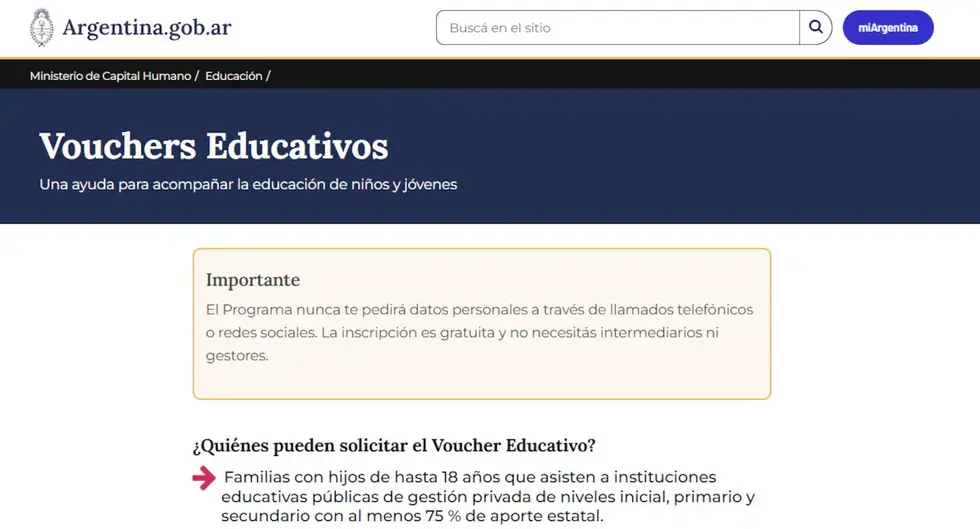 - Ingresar a la plataforma oficial de Vouchers Educativos con el usuario de Mi Argentina tanto en la app como en la web.